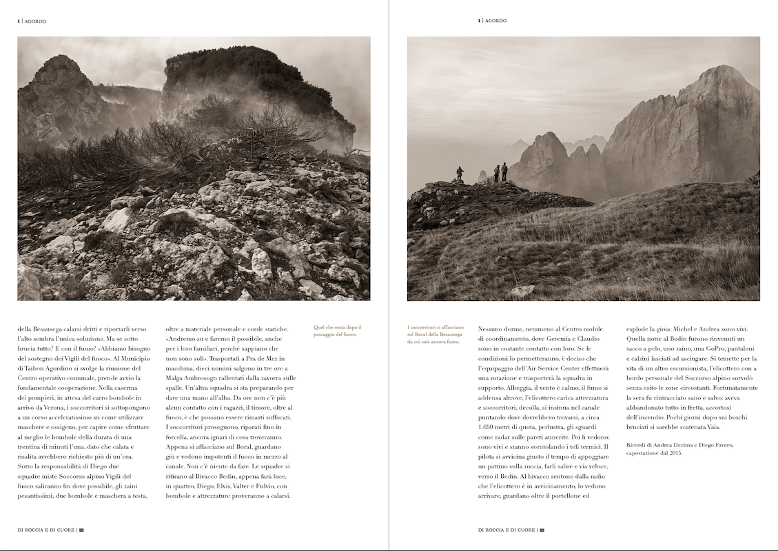 Non è stato per niente semplice reperire il materiale iconografico. Al tempo stesso le fotografie scelte a corredo spaziano dagli inizi all'odierno, rendendo l'idea del tempo passato, dell'intensità vissuta, della varietà di scenari e operazioni. In alcuni casi è stato sorprendente: ad esempio ho rinvenuto le foto originali del recupero dei sette giovani periti sull'Antelao nell'archivio di Intesa Sanpaolo, con conseguente richiesta ufficiale. Tanti amici, da Luca Bellus, a Giorgia Hofer, da Francesco Sauro ad Alberto Perer, ci hanno regalato i loro splendidi scatti di montagna da alternare alle foto storiche. Grazie a loro e ad Andrea Filippin, che ha curato lo splendido progetto grafico